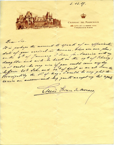 Letter from Prince Louis II of Monaco to de László regarding the artist's arrival dates in Monaco (for sittings, presumed)