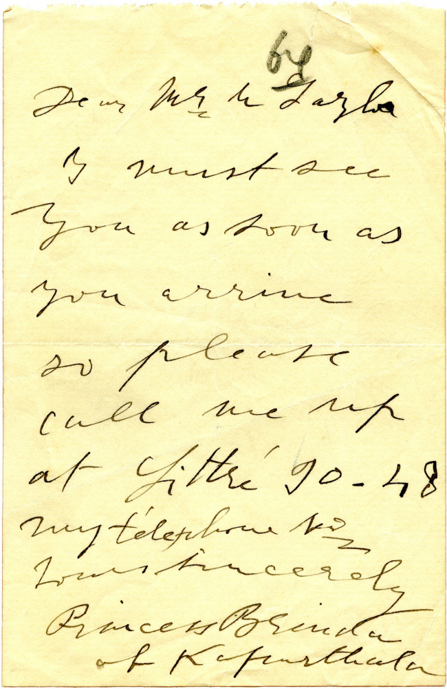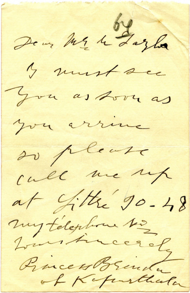 Undated letter from Princess Kapurthala to de László requesting he call on her when he arrives in Paris