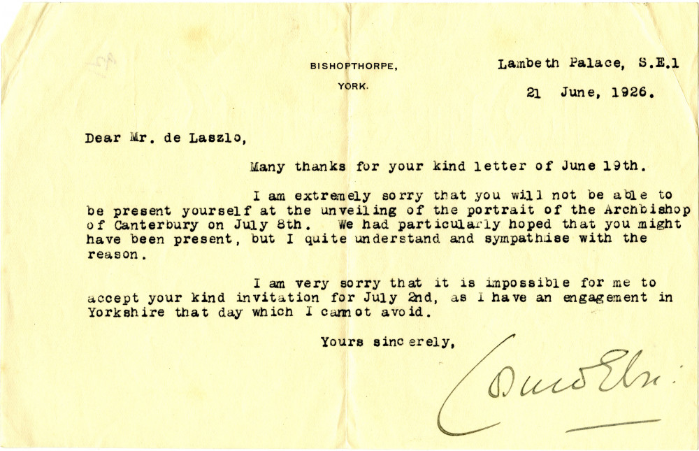 Letter from Cosmo Gordon Lang (then Archbishop of York) to de László. Regrets artist will miss unveiling of Archbishop of Canterbury's portrait [4632]; regrets must decline artist's invitation for 2 July (1936)