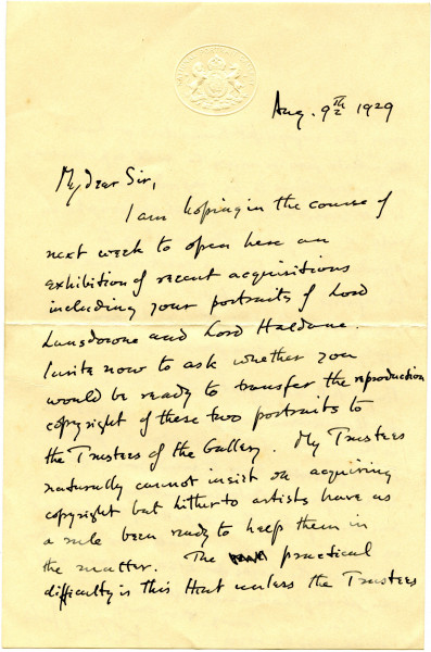 Letter from Henry Hake (Director of the National Portrait Gallery) to de László requesting reproduction copyright of two recently acquired portraits [5959][5552] ahead of their exhibition; will send cheque for £150