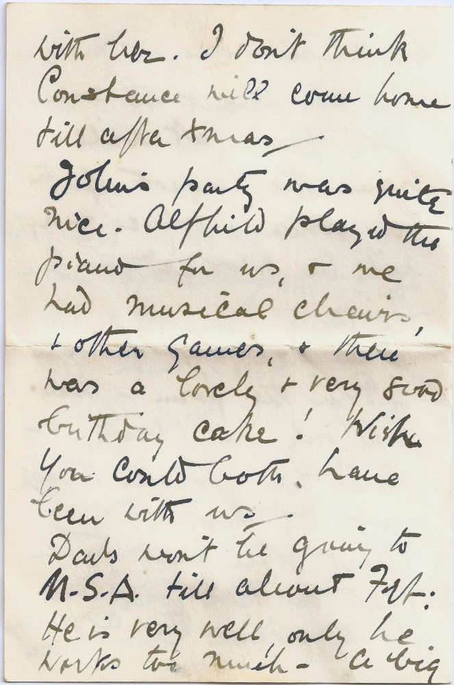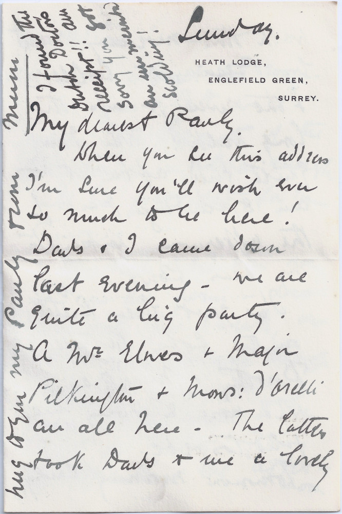 Undated letter from Lucy to Paul de Laszlo with family news, including a stay at Heath Lodge, home of Baron Schröder, company included: Mr Elwes; Major Pilkington & Monsieur d'Orelli. John's birthday party
