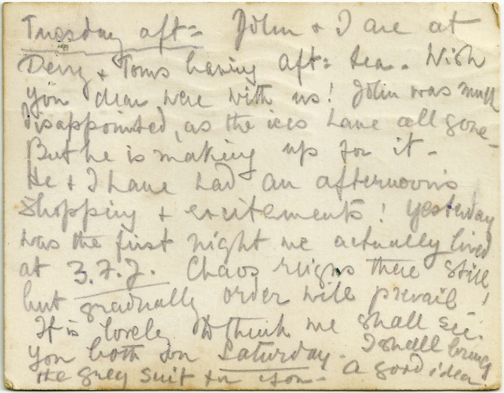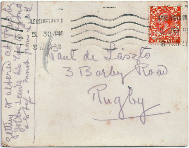 Postcard from Lucy to Paul de Laszlo describing a day out with John in Kensington; first night spent at 3 Fitzjohn's Avenue