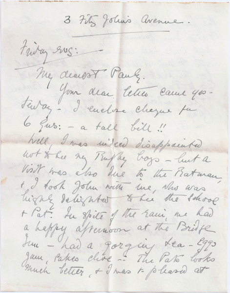 Letter from Lucy to Paul de Laszlo with general news including "Ratman" joining Paul & Stephen at Rugby; continuing building works at 3 Fitzjohn's Avenue