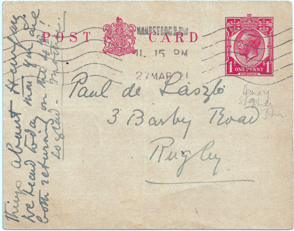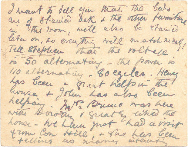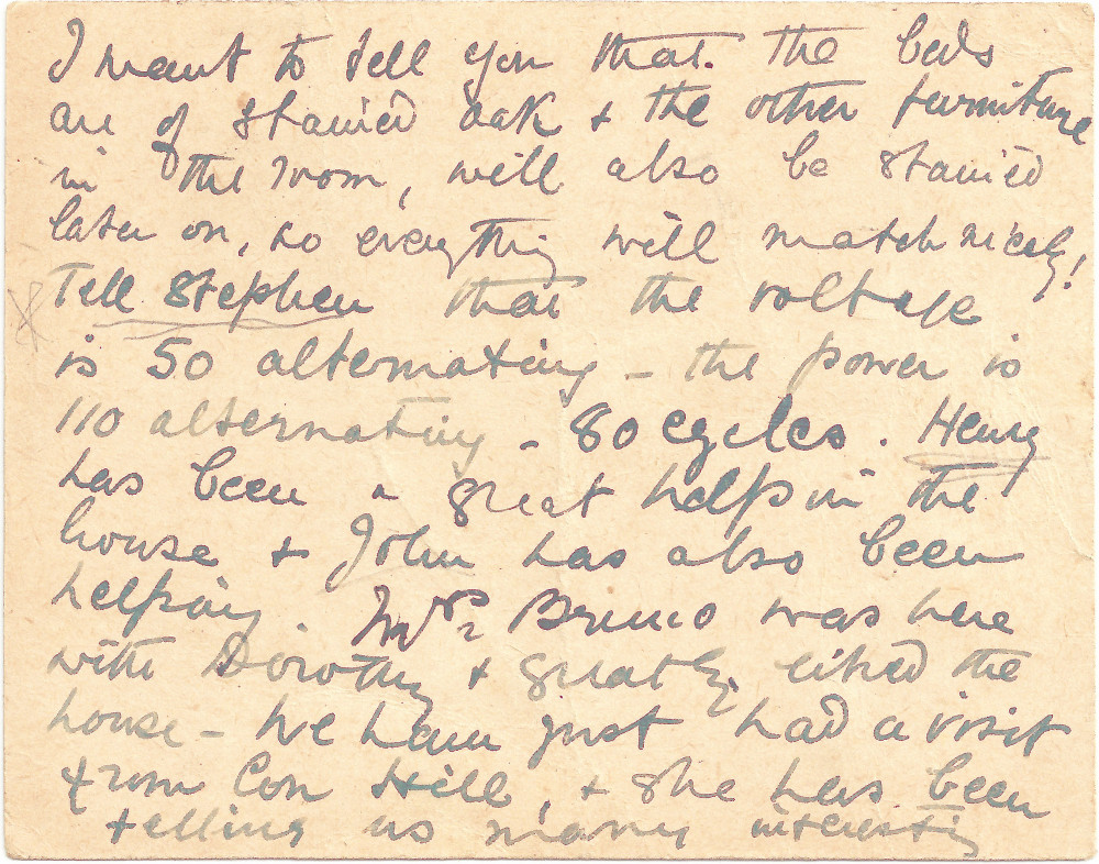 Postcard from Lucy to Paul de Laszlo with a description of the furniture and voltage in 3 Fitzjohn's Avenue; Mrs [Brunco?], Dorothy and Con Hill have all visited the new house
