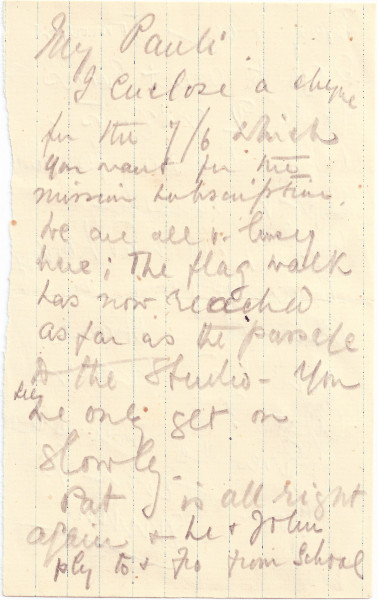 Letter from Lucy to Paul de Laszlo with general family news, including work on the flagstone path to the studio and Aunt Eva coming to stay for two nights