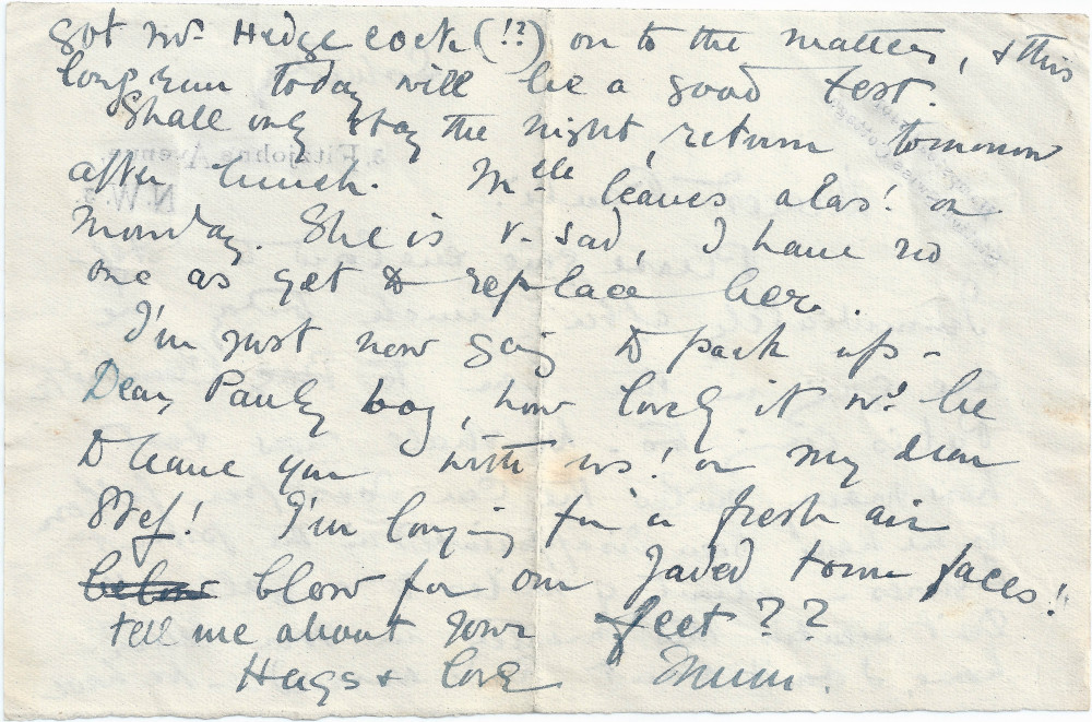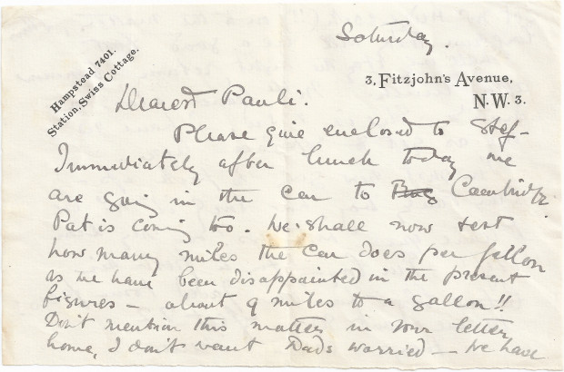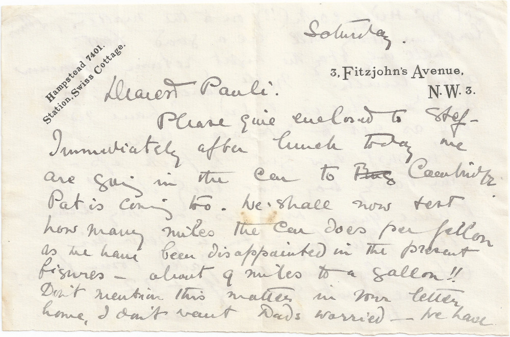 Letter from Lucy to Paul de Laszlo with general news including plans to travel to Cambridge to test out car; "Mlle" (likely a governess/nanny of the de László family) will leave with no replacement as yet