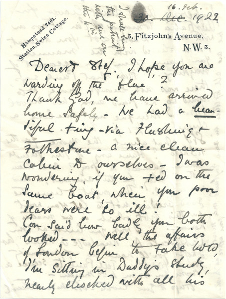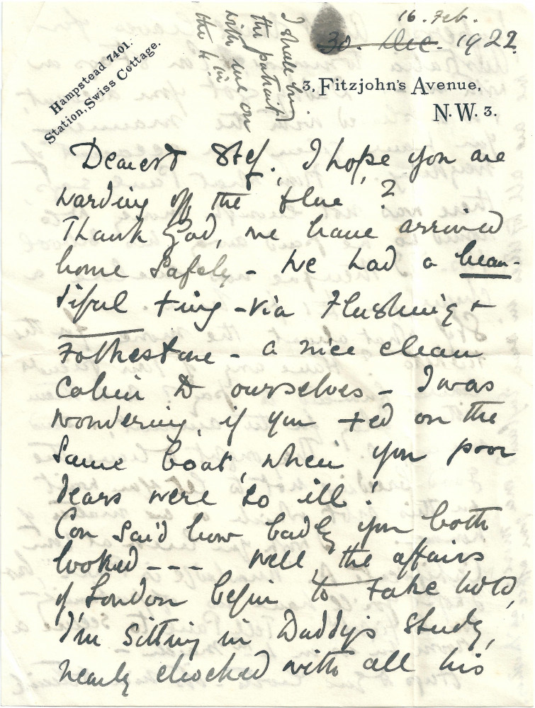 Letter from Lucy to Stephen de Laszlo with general news including her return journey via Flushing and Folkestone; Aunt Ethel to leave for Australia; will bring a portrait [unidentified] with her on 4 Mar [1922]