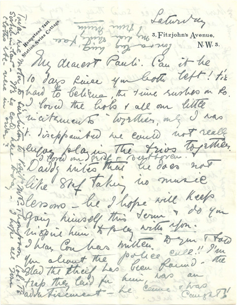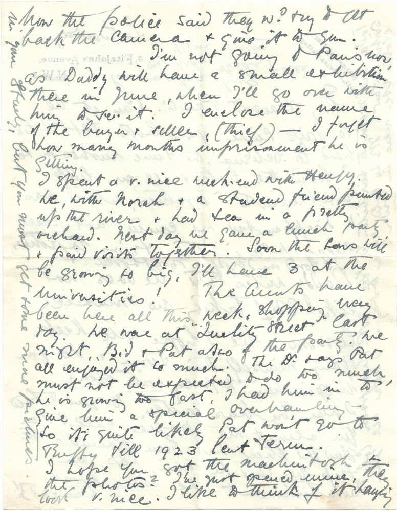 Letter from Lucy to Paul de Laszlo with general family news including the theft of Paul's camera; de László's June exhibition in Paris mentioned [assumed Knoedler's]; Patrick having problems with spine; Lucy's visit to "Mrs Thompson Col. T's sister-in-law"
