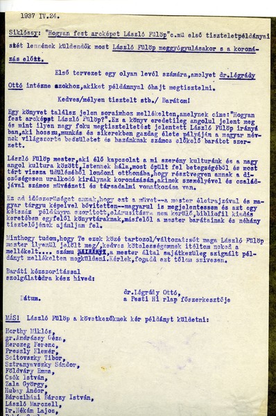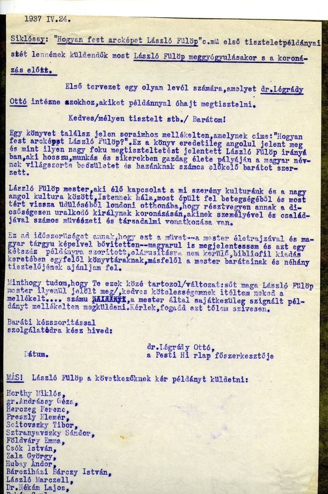 Complimentary copies of the Hungarian edition of "Painting a Portrait" will be sent out now that de László has recovered and before the Coronation. First draft of a letter which Légrády intends to send to all recipients of the complimentary copies.