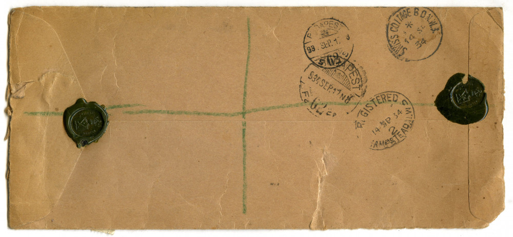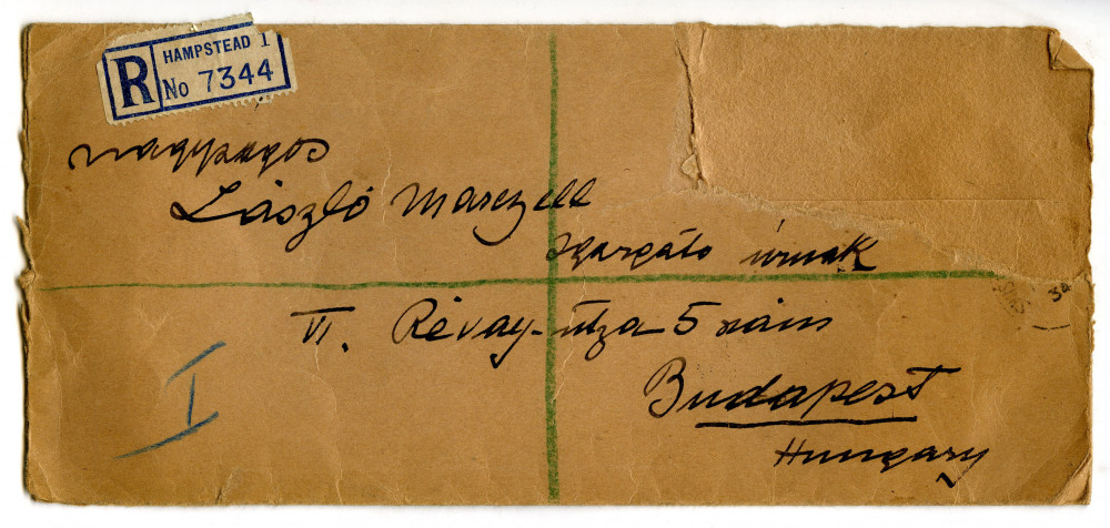 Envelope addressed to Marczell 'Marczi László' László in de László's hand, postmarked 14 Sep [19]34, Swiss Cottage.