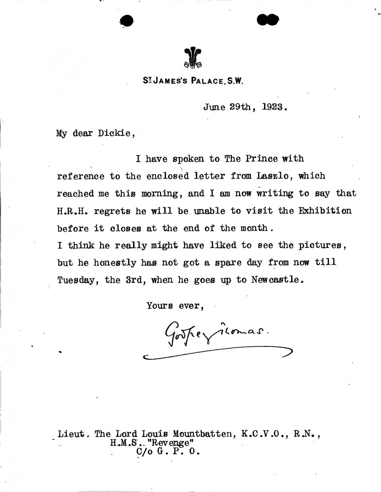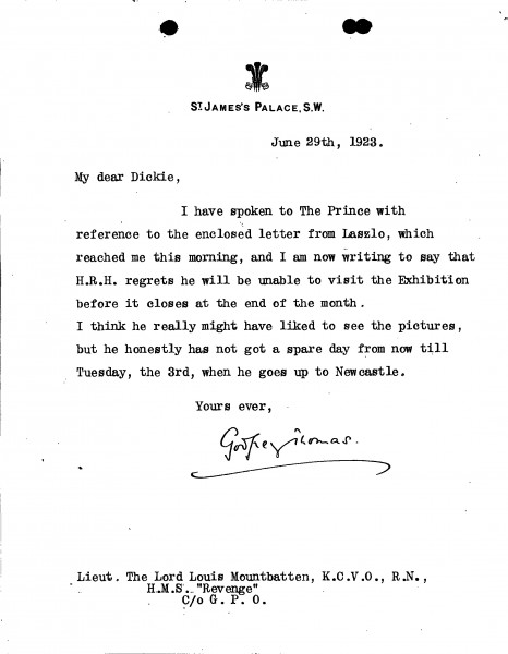 Sir Godfrey Thomas informs Lord Louis Mountbatten that the Prince [of Wales] regrets he is unable to visit de László's exhibition (French Gallery, June 1923).