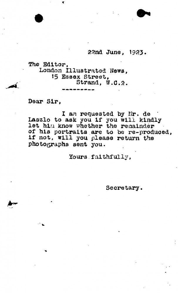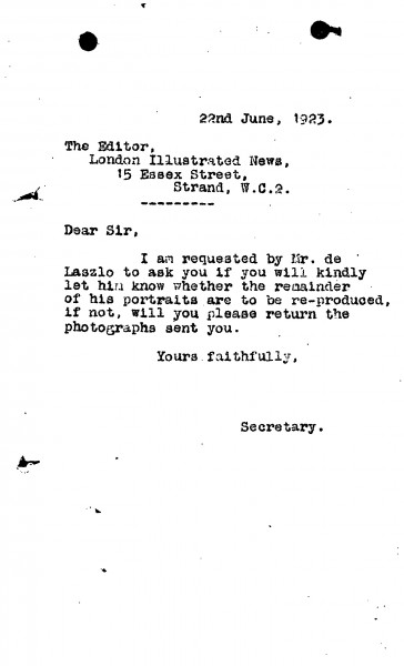Concerning reproduction/publication of portraits in conjunction with de László's exhibition (French Gallery, June 1923).