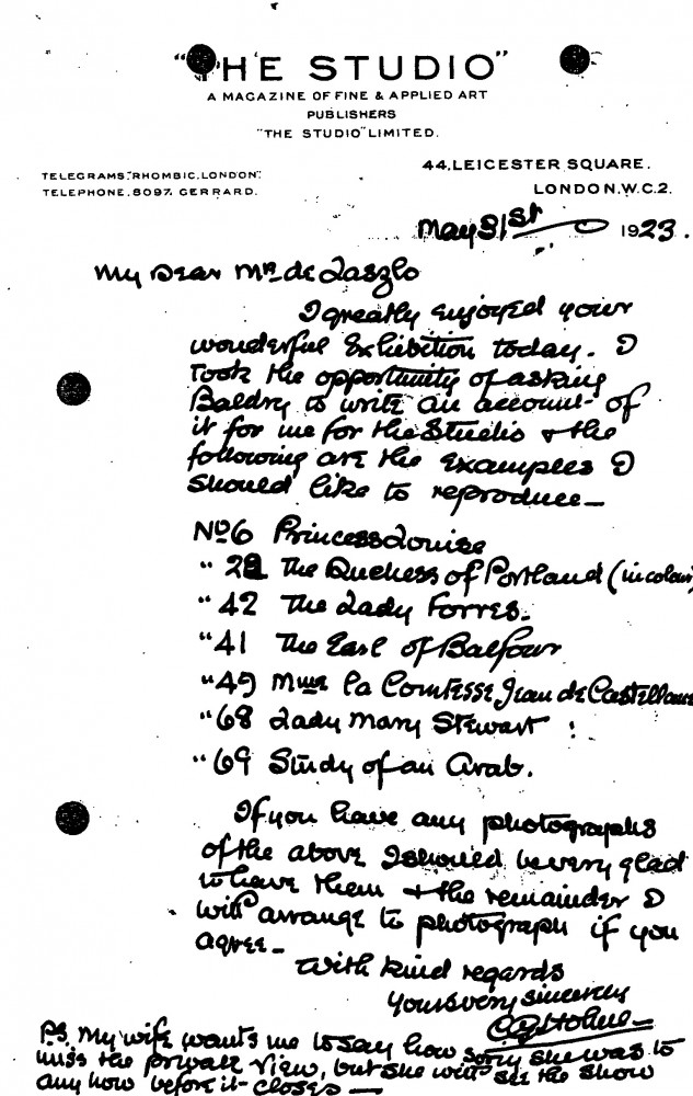 Holme has asked Baldry to write an article on de László's exhibition (French Gallery, June 1923); requests photographs for reproduction.