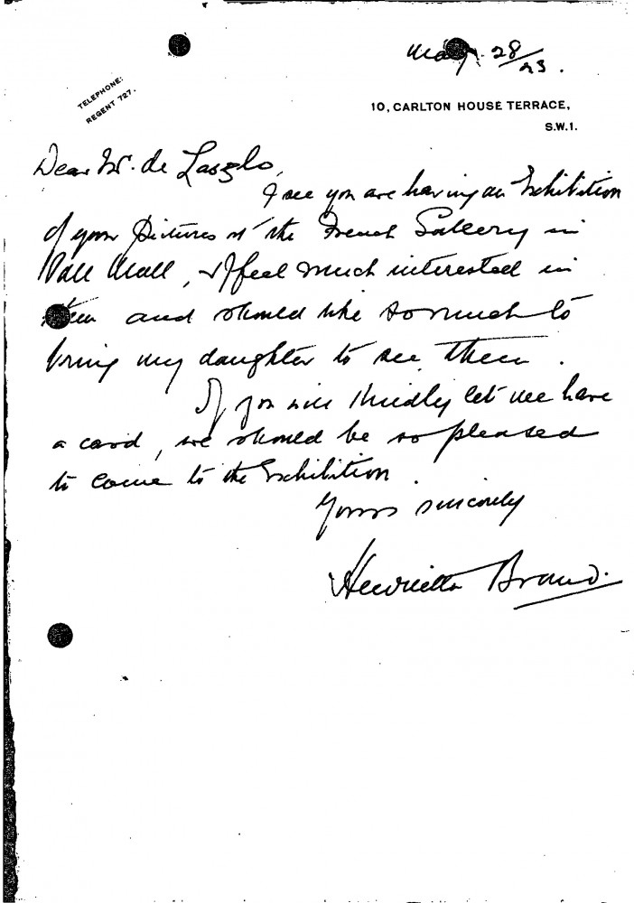 Request for an invitation to de László's exhibition (French Gallery, June 1923).