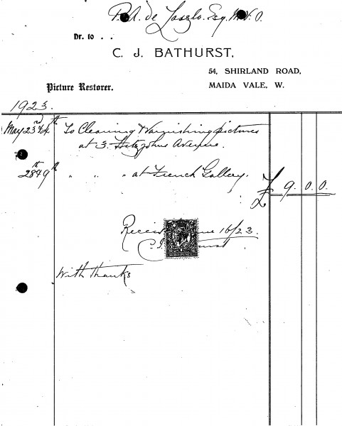 Invoice from C. J. Bathurst to cleaning & varnishing pictures at 3 Fitzjohn's Avenue and the French Gallery for de László's exhibition (French Gallery, June 1923).