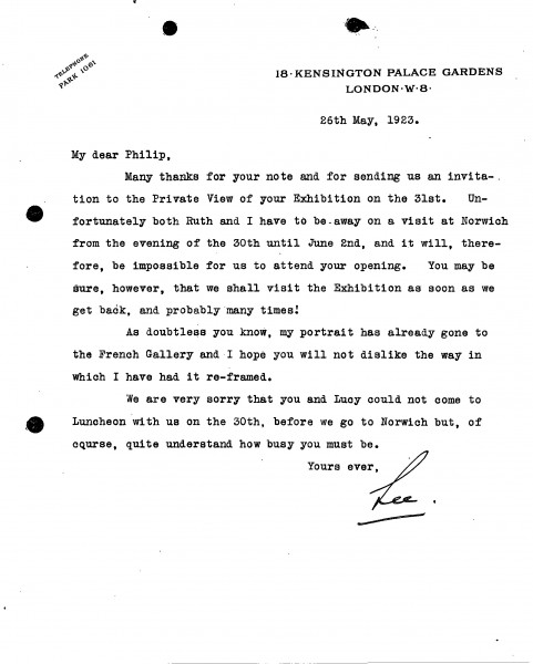 Lord Lee cannot attend the private view (French Gallery, June 1923). His portrait [6191] has been sent to the French Gallery; it has been reframed.