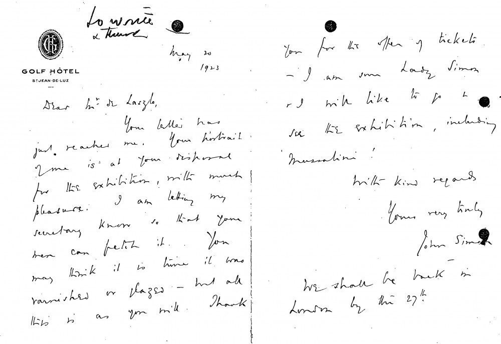 Letter from Sir John Simon to de László, Exhibition at French Gallery London June 1923, 106-0103
