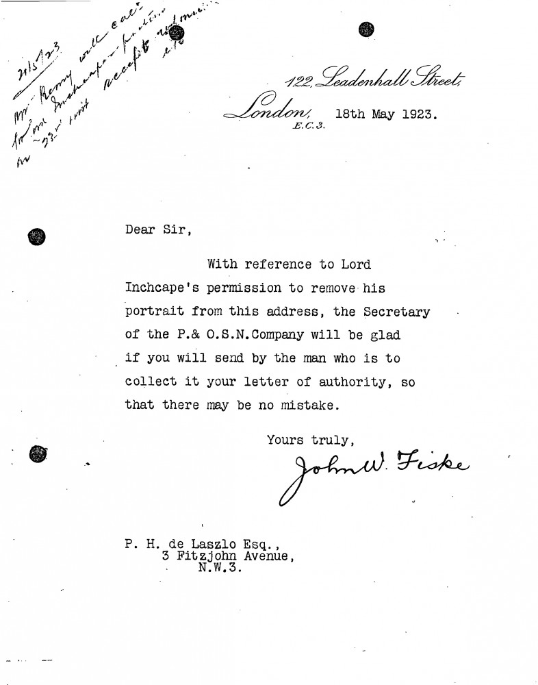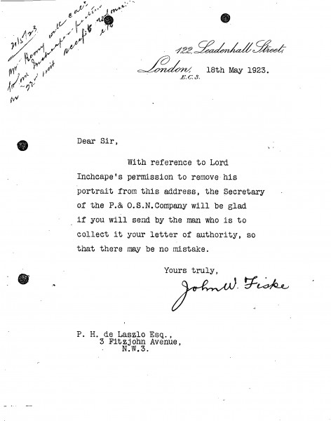 Collection of Lord Inchcape's portrait [3161] by the framer for de László's exhibition (French Gallery, June 1923).