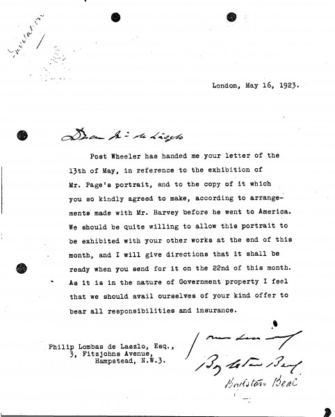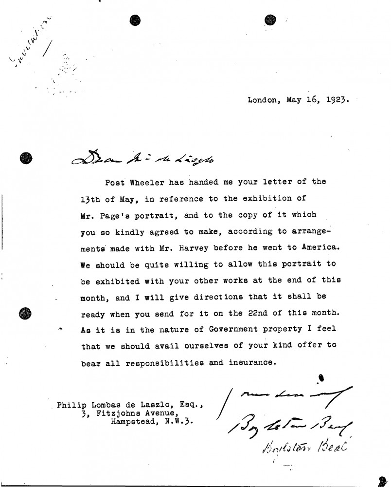 Beal thanks de László for agreeing to make a copy [111838] of Walter Hines Page's portrait [6498]; he gives permission for the original [6498] to be exhibited (French Gallery, June 1923).