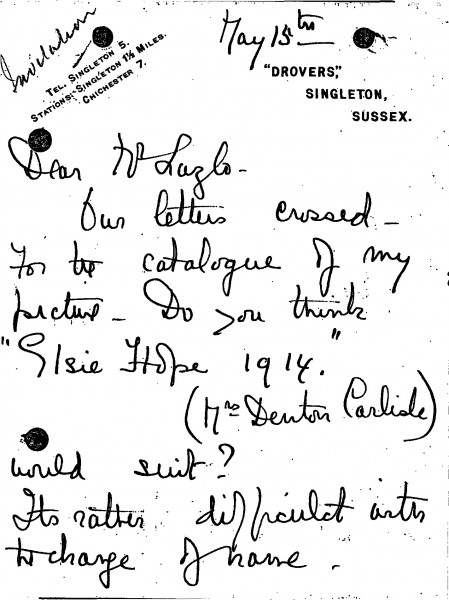 Delivery of portrait [10763] for de László's exhibition (French Gallery, June 1923). Suggestion for the picture's title in the catalogue.