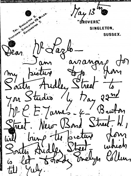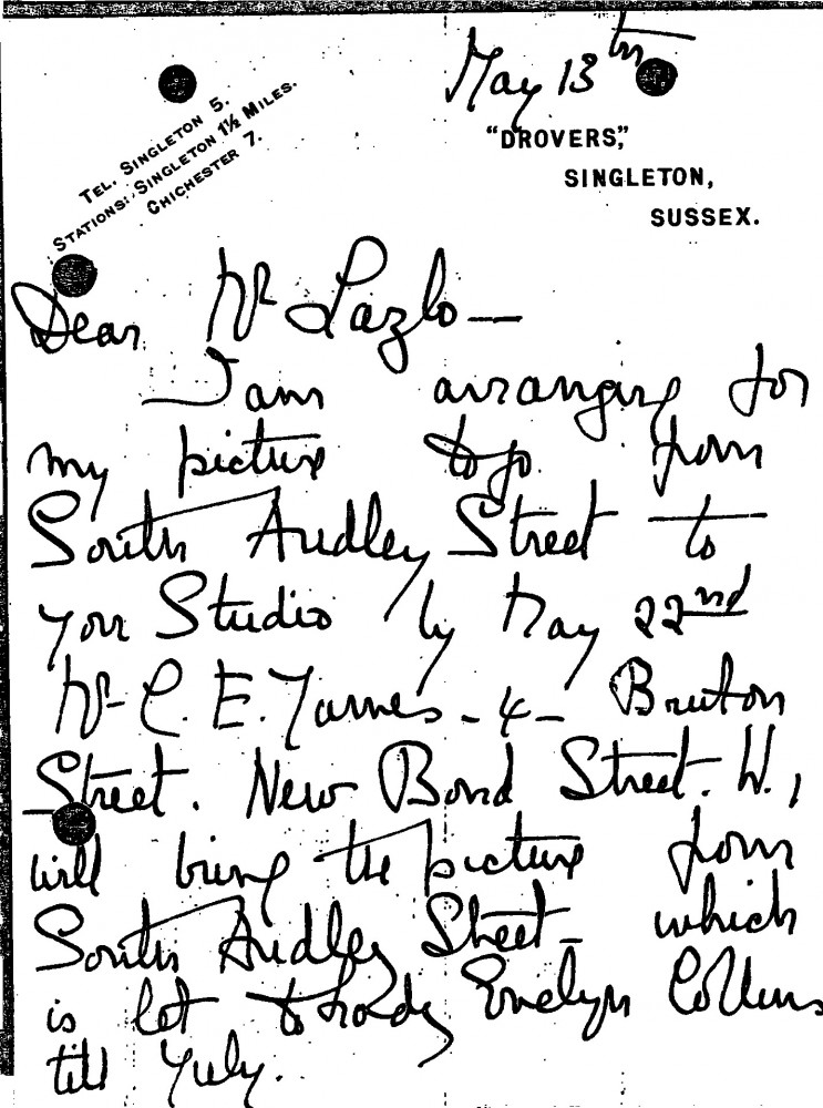 Delivery of portrait [10763] for de László's exhibition (French Gallery, June 1923). Encloses list of people to be invited.