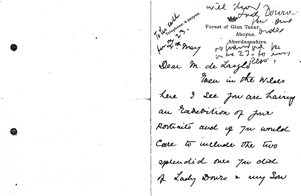 Lady Glentanar offers portraits of the Marchioness of Douro [3999] and her son [5357] to de László for his forthcoming exhibition (French Gallery, June 1923).