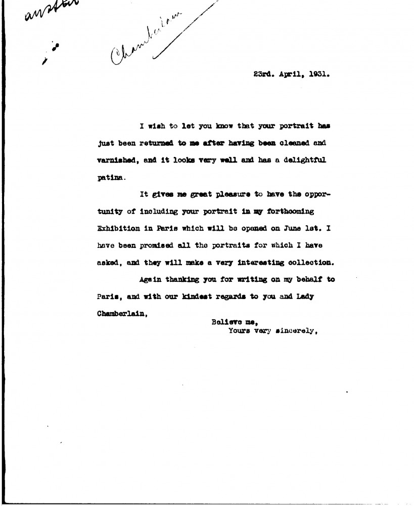De László confirms that Austen Chamberlain's portrait [3797], which has been lent for the artist's exhibition in Paris (Charpentier, 1931), has been cleaned and varnished