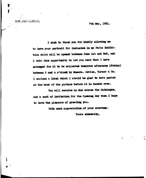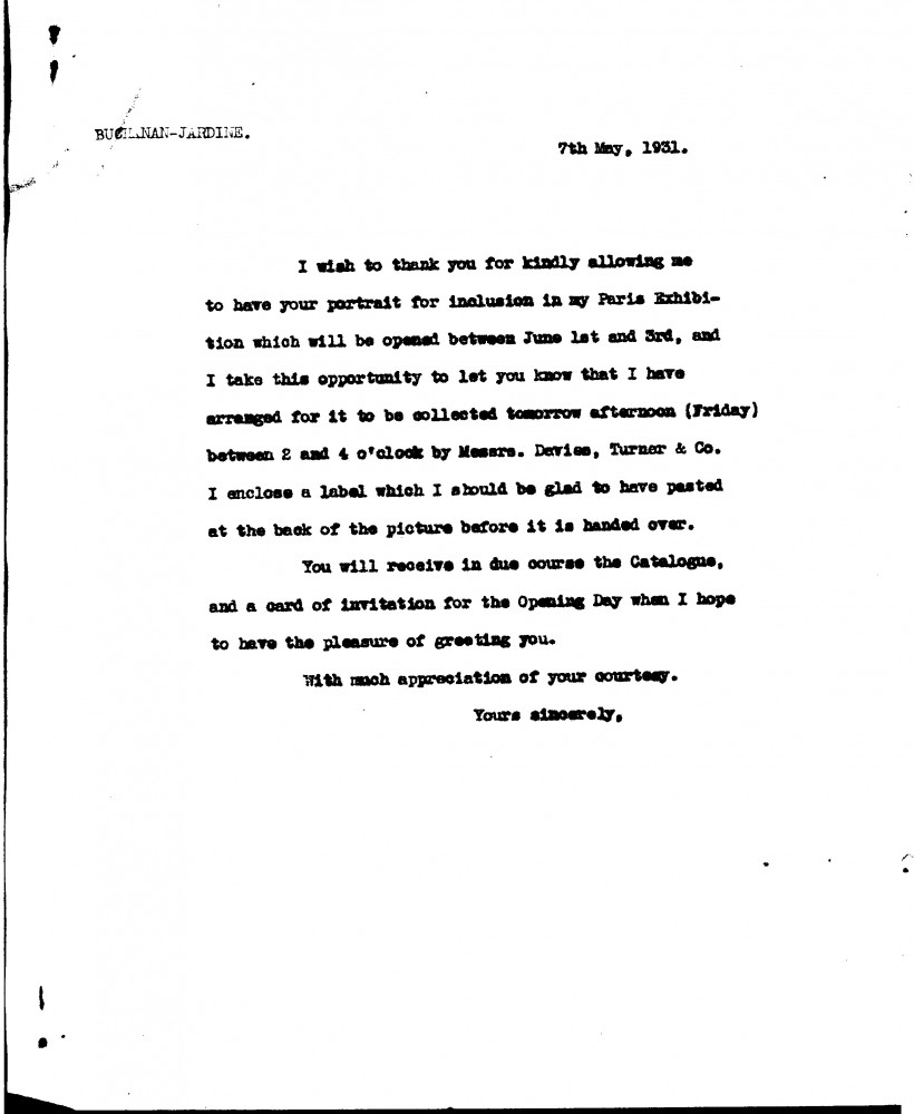 De László thanks Lady Buchanan-Jardine for agreeing to lend her portrait [3739] to his forthcoming exhibition in Paris (Charpentier, 1931)