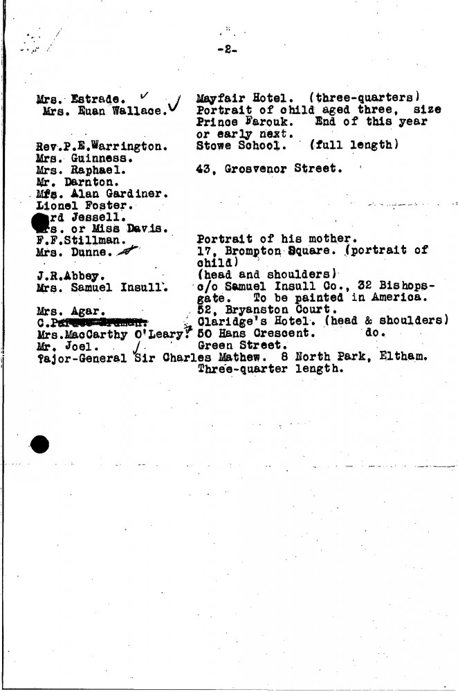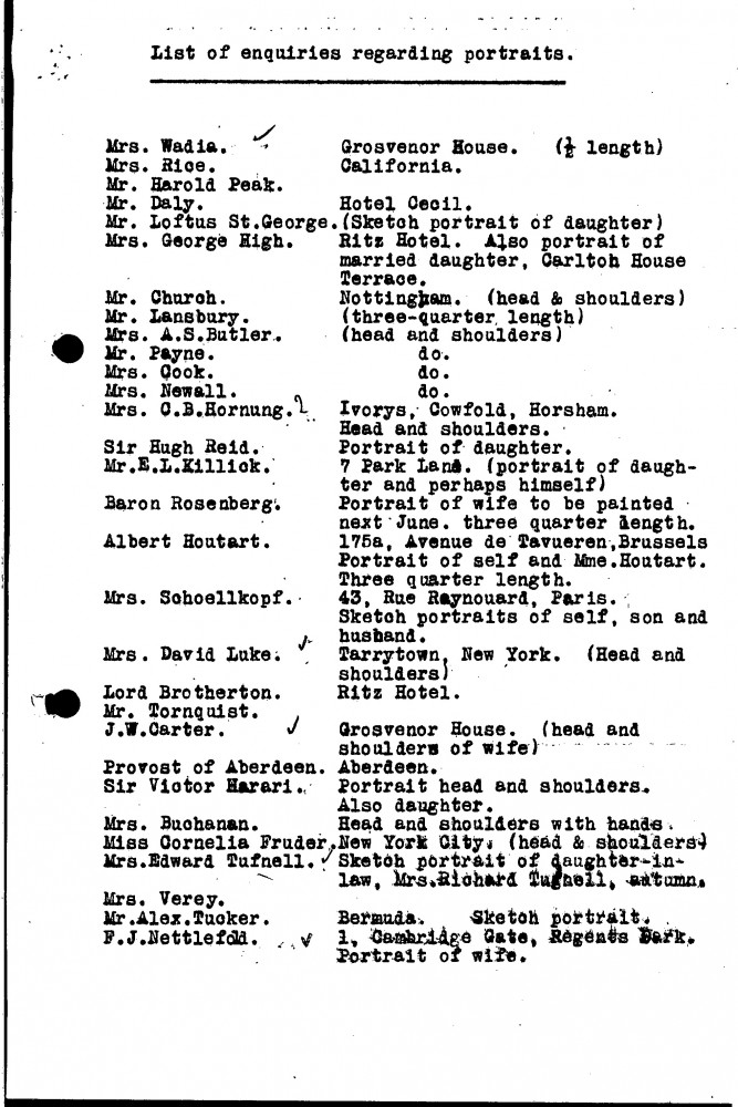 List of enquiries regarding portraits following de László's exhibition at the French Gallery, 1929.
