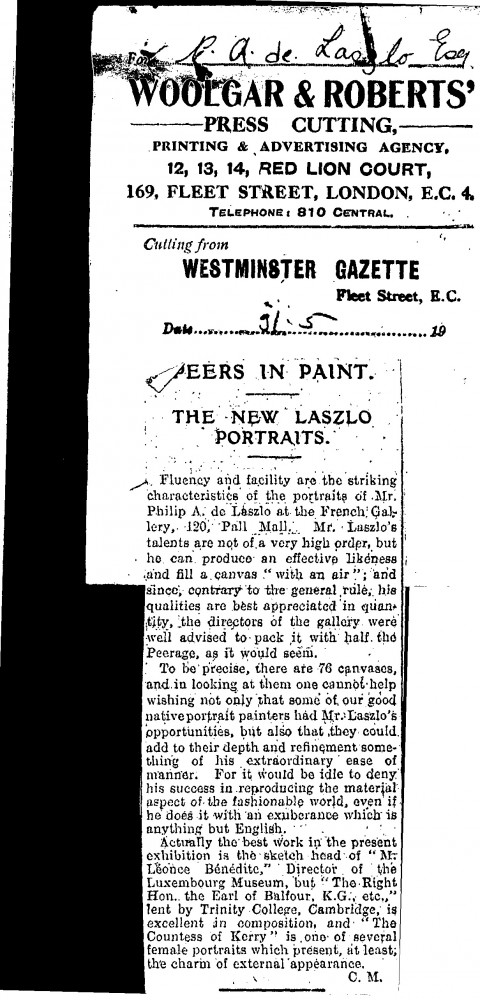 Westminster Gazette. Review of de László's exhibition (French Gallery, June 1923) praising his skill and fluency in capturing likenesses but noting a lack of depth. Highlights portraits of M. Léonce Bénédite [110437], the Earl of Balfour [2707], and the Countess of Kerry [3143].