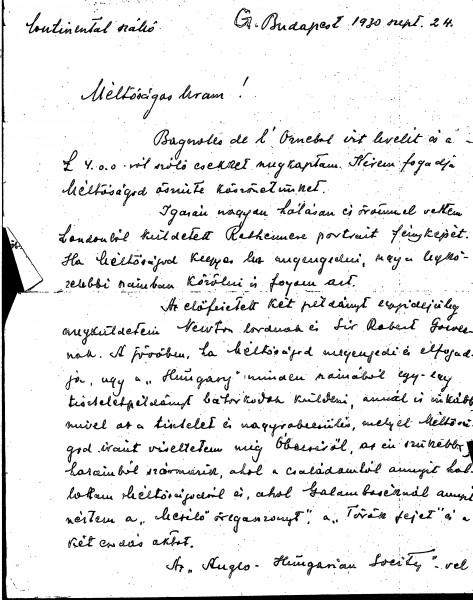 Gerster thanks de László for a photo of Lord Rothermere’s portrait [4759]. He sent copies of the magazine “Hungary” to Lord Newton and Sir Robert Gower; he offers to send a copy to de László. He is from Óbecse and has seen the artist's The Storyteller [10937], Man Wearing a Fez [111291] and “two beautiful nudes” [possibly 110962]. References to the “Anglo-Hungarian Society”.