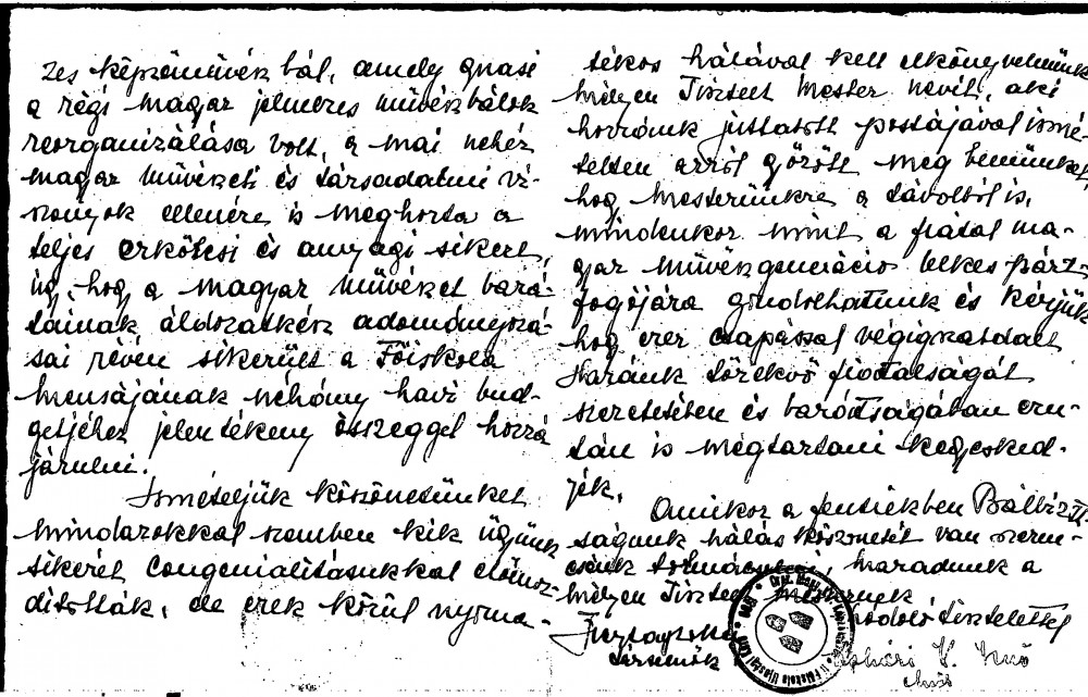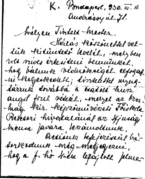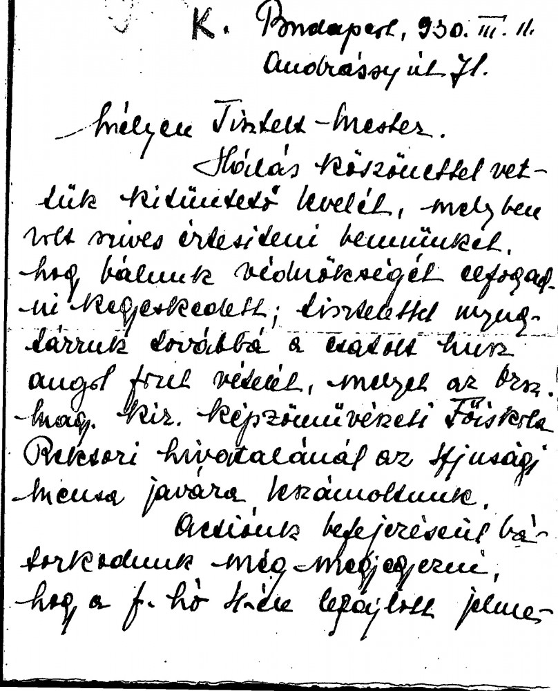 Jenő Ujházi, President of the Students’ Union of the Academy of Fine Arts, thanks de László for agreeing to become patron of their ball, and for a ₤20 donation that he gave to the students’ mess.