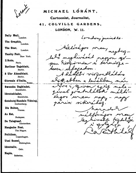 Mihály Lóránt accepts an invitation and congratulates de László on his success in Paris.