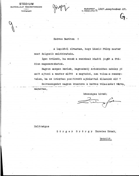 Letter from the Director of Stádium Publishing Company to Colonel György Görgey requesting he asks de László if Stádium can obtain the publishing rights to the artist's memoirs.