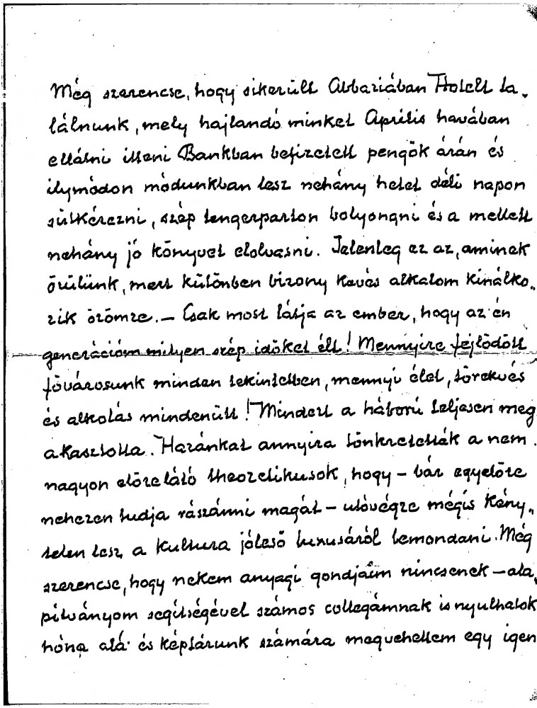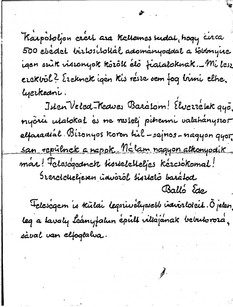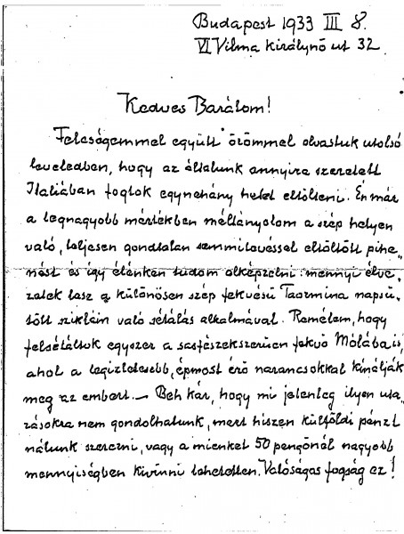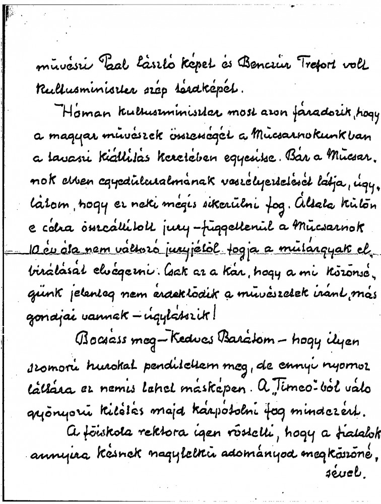 Balló mentions de László’s forthcoming holiday in Sicily. These are difficult times in Hungary, both economically and culturally. Reference to Bálint Hóman's plans for the Műcsarnok’s spring exhibition. Thanks de László for a donation he made to the College of Fine Arts.