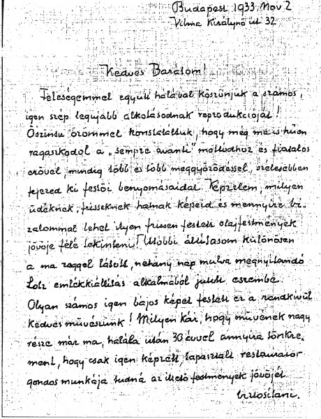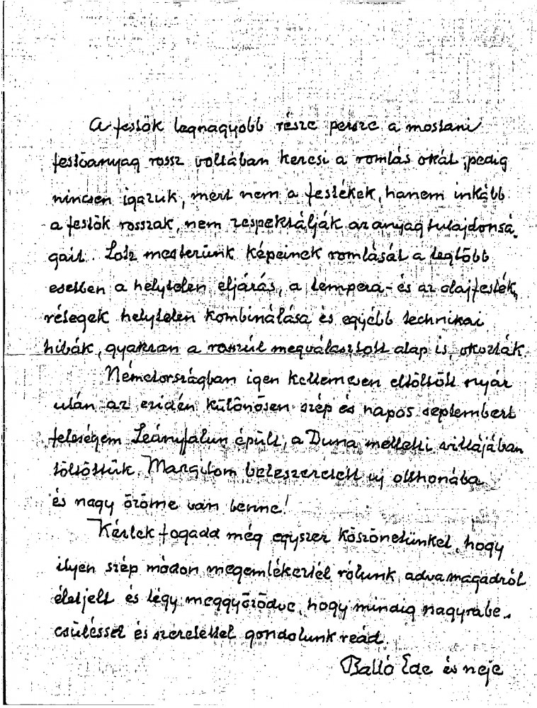 Balló thanks de László for the reproductions; pleased that de László continues to work tirelessly. Mentions a retrospective exhibition of Károly Lotz's paintings, which are now in a poor condition owing to faulty technique.