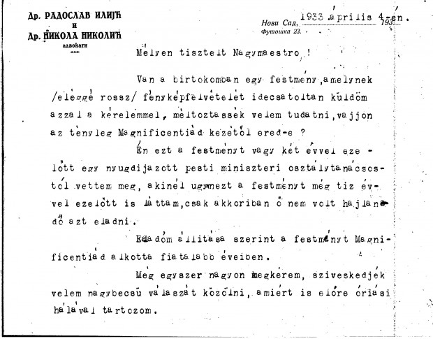 Dr. Radoslav Ilijć requests authentication of what is believed to be an early work of de László. The painting is not identified in the letter; it was purchased from a retired Hungarian government ministerial adviser.