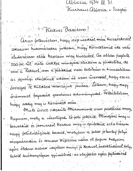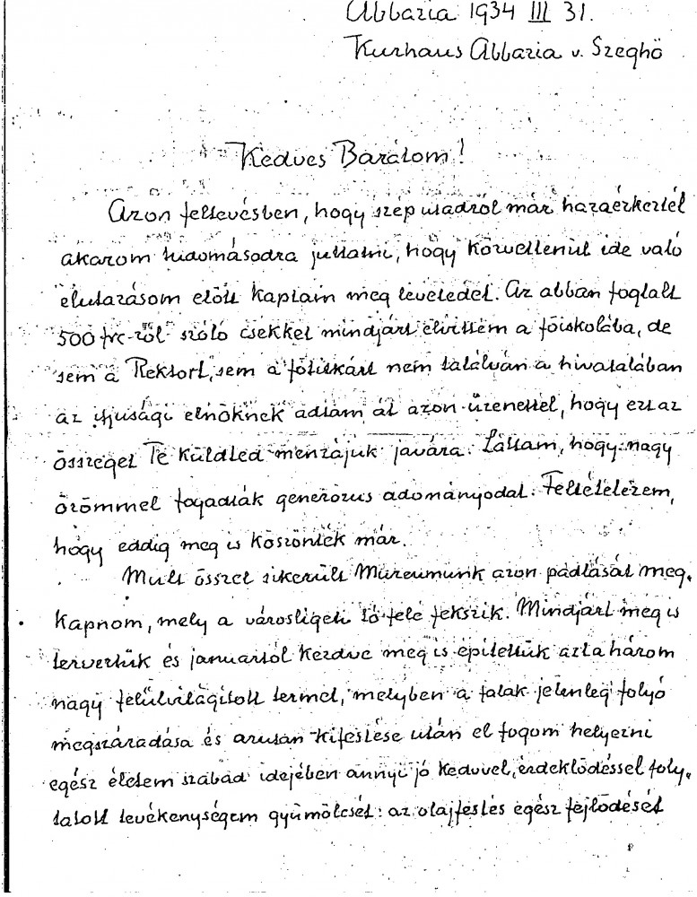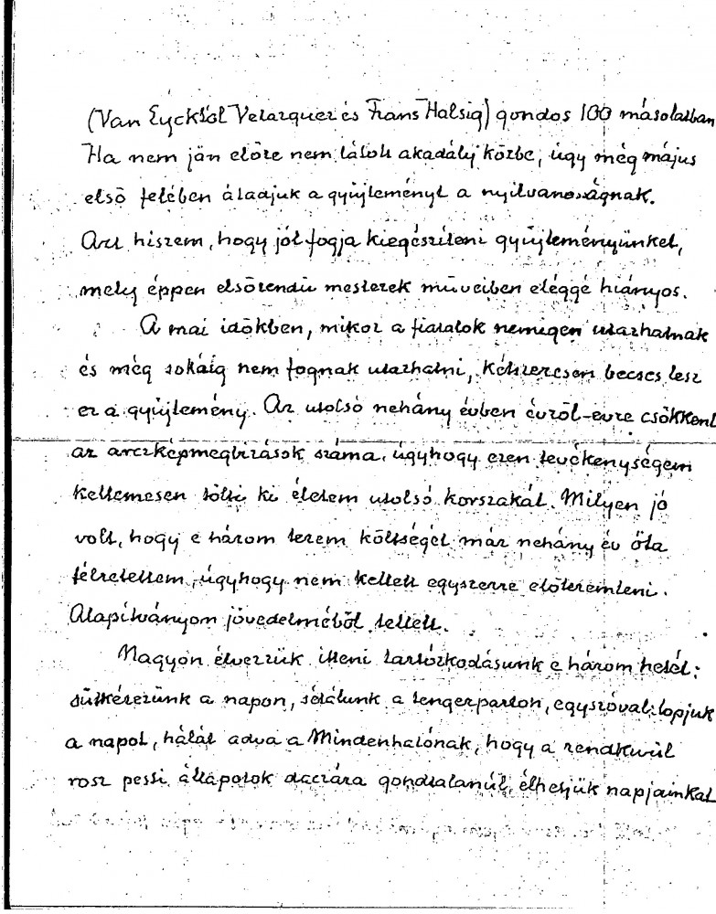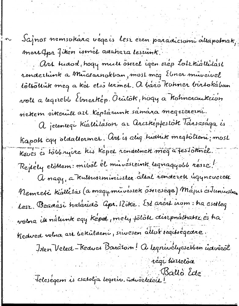 Balló refers to a donation de László made to help students at the College. Plans to exhibit his collection of 100 copies presenting the history of oil painting. Refers to an earlier exhibition in the Műcsarnok commemorating Lotz, and to a more recent one on Ébner; the Society of Portrait Painters could barely fill a room in the exhibition due to decreasing commissions. The Ministry of Culture is organising a National Art Exhibition – will de László participate?