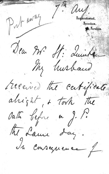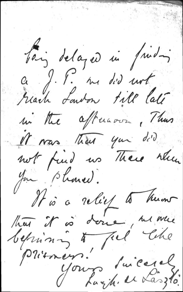 Letter from Lucy to Jeffrey Charles St. Quintin confirming de László took the oath before a Justice of the Peace and received the certificate the same day. "It is a relief to know that it is done", Lucy writes, "we were beginning to feel like prisoners!" [dated 7 [Aug?]]