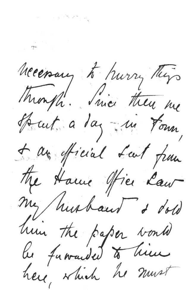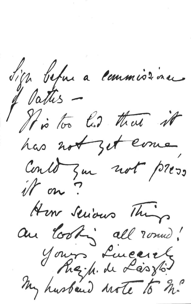 Letter from Lucy to Jeffrey Charles St. Quintin requesting he puts pressure on the Home Office to send the papers de László is obliged to sign before a Commissioner of Oaths