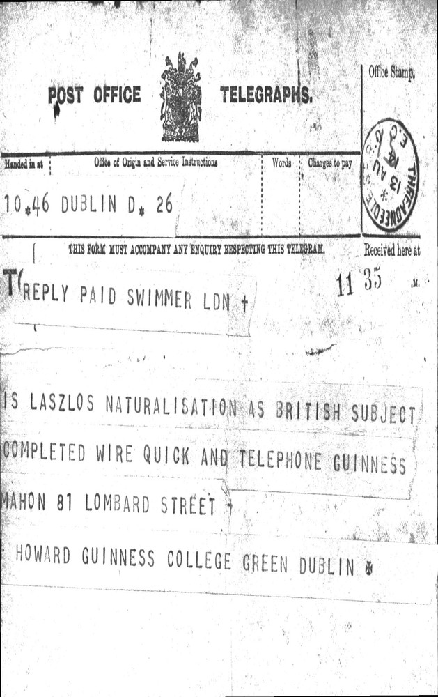 Telegram from Howard Rundell Guinness to Charles Jeffrey St. Quintin (recipient assumed: see DLA165-0022) asking whether de László's naturalisation has been completed