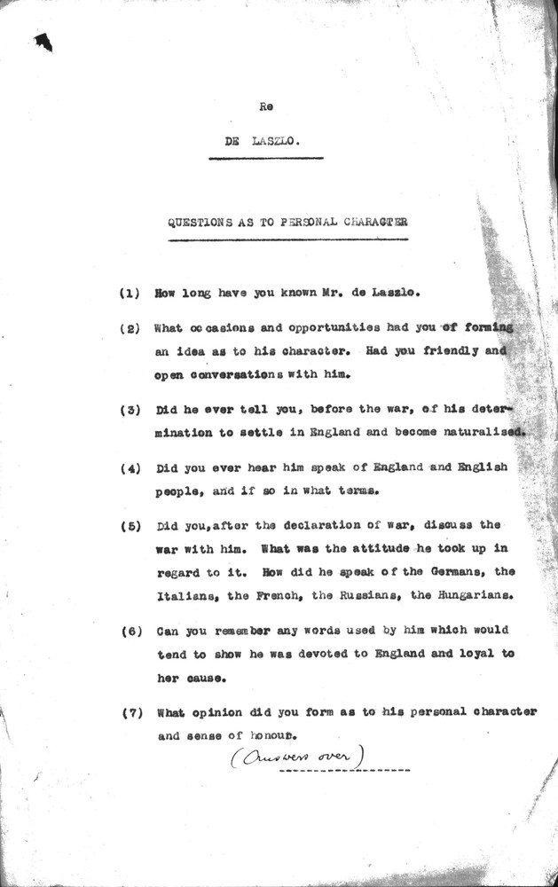 Document: "re de Laszlo. Questions as to Personal Character" to be completed for de László's application for naturalisation