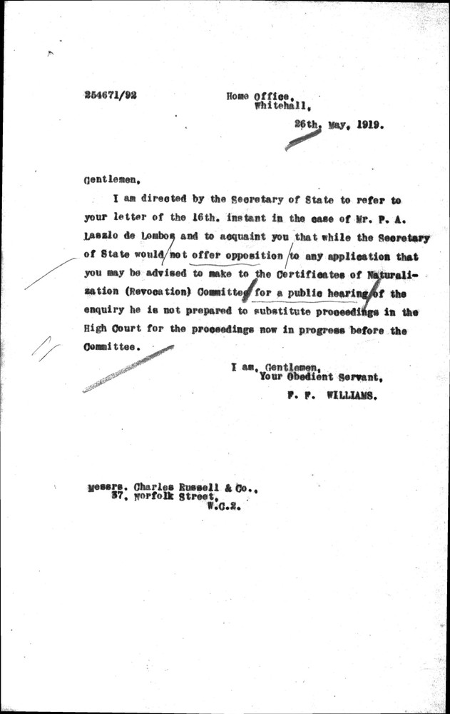 Letter from F. F. Williams (Home Office) to Charles Russell & Co. stating that the Secretary of State is not prepared to substitute proceedings in the High Court for the proceedings in progress before the Certificates of Naturalization (Revocation) Committee