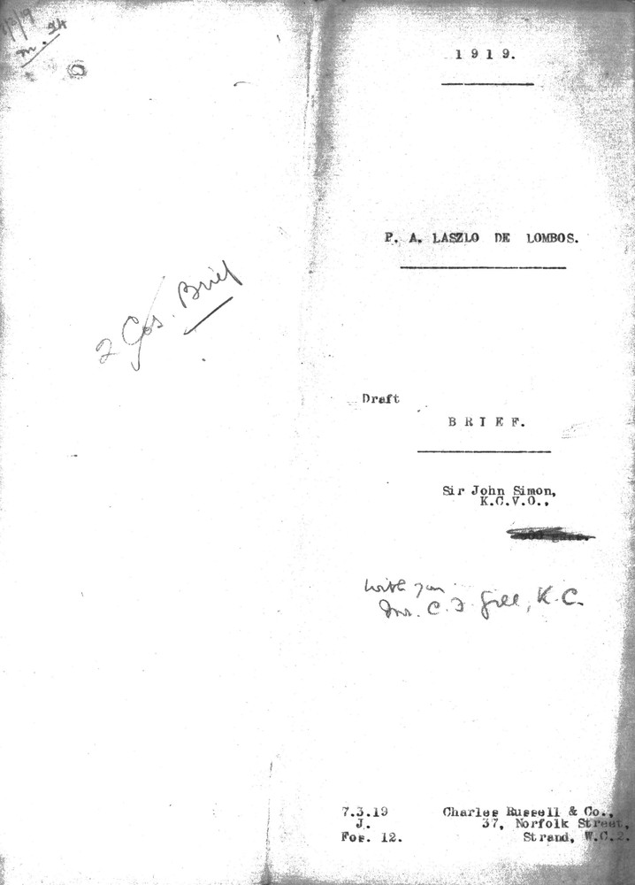Draft of a brief by Sir John Simon regarding de László's case and associated reputational damage with some handwritten annotations (see related item DLA163-0009)