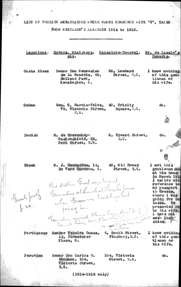 List of foreign Ambassadors whose names commence with ‘G’ taken from Whitakers Almanacs 1914-18 [with handwritten annotations].