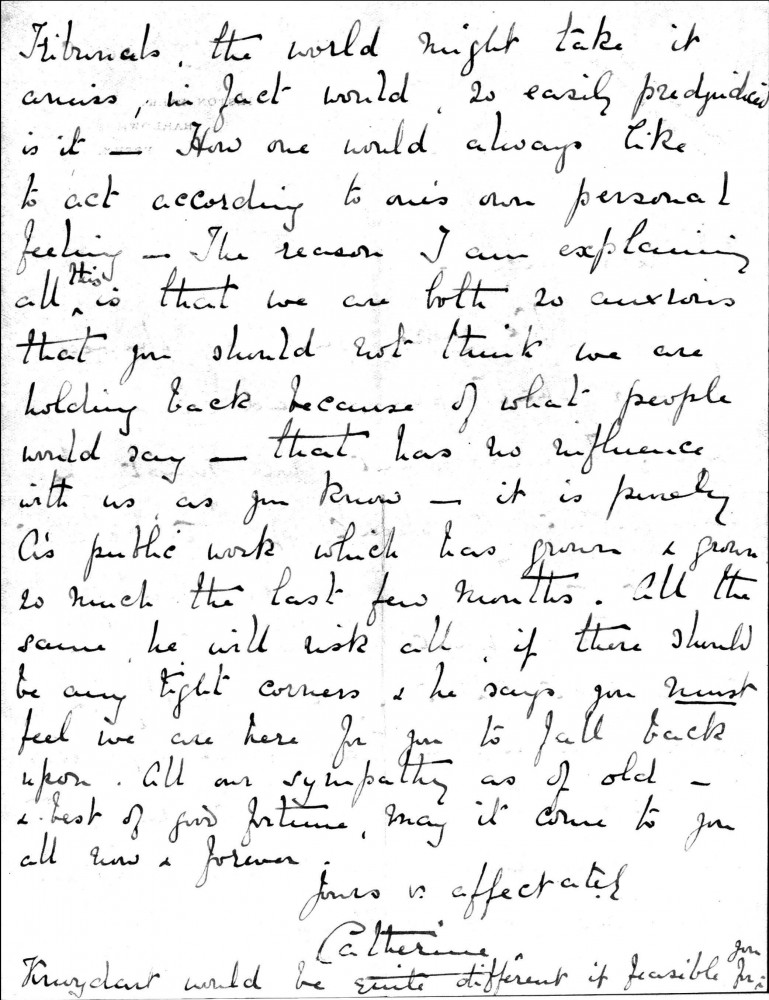 Catherine Bowlby explains to Lucy why she and Arthur have decided to remain quiet, presumably on the question of de László's internment. "[W]e are both so anxious that you should not think we are holding back because of what people would say ... it is purely A's public work which has grown & grown", she writes