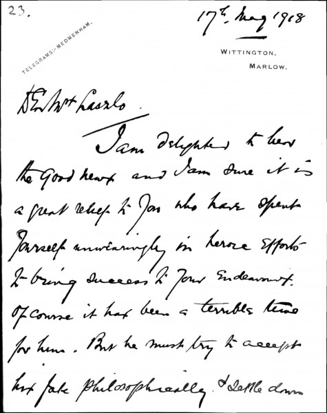 Lord Devonport is delighted to learn the good news that Lucy has succeeded in her efforts [to have de László moved from Holloway Prison]