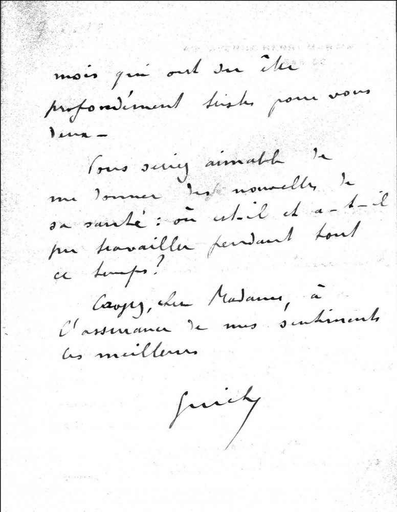 The duc de Guiche has received a note from Sir Charles Russell regarding the correspondence that led to de László's internment; Guiche hopes de László will be found innocent; he asks after the artist's health and whether he has been able to work