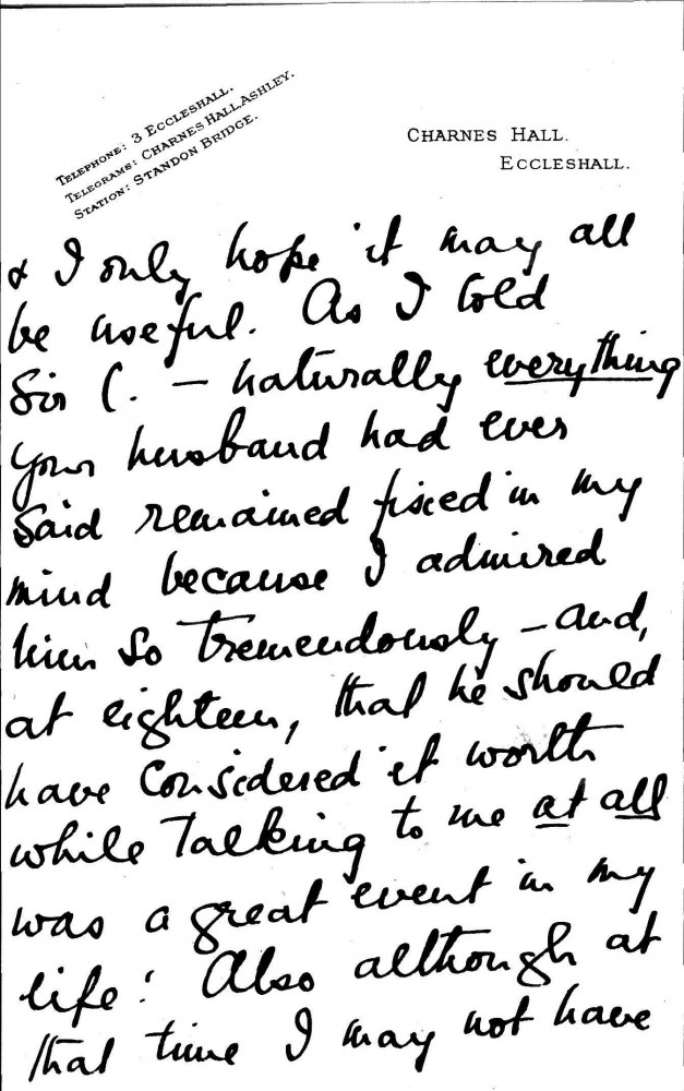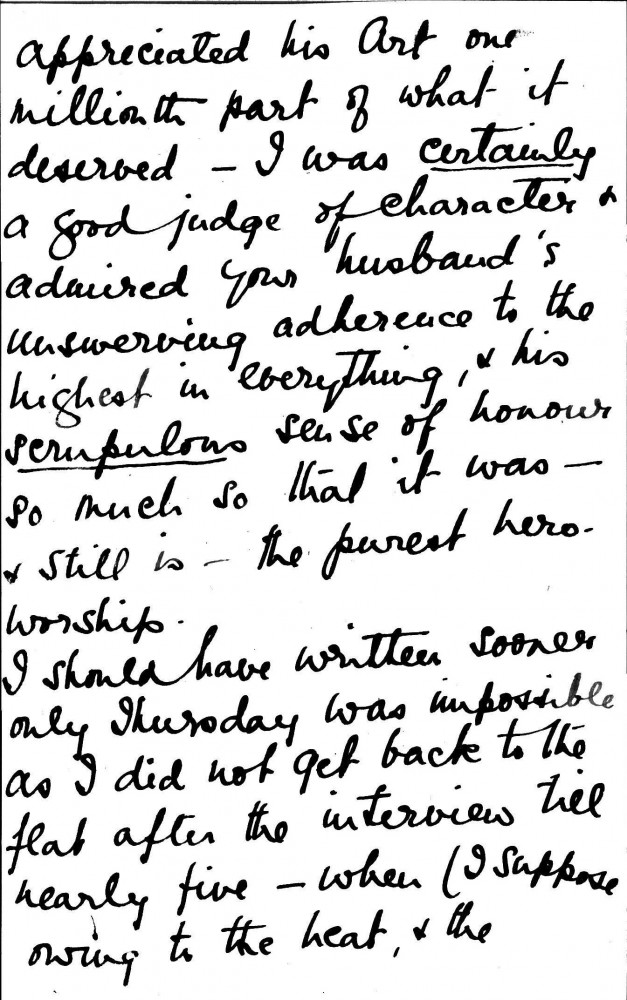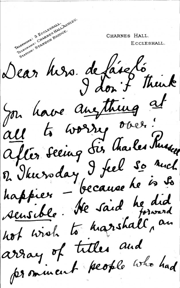 Concerning Jean Hall's interview with Sir Charles Russell. She agrees with Russell's "sensible" approach to de László's case, which is to show that he and Lucy had long-contemplated settling in England; Hall heard them express this desire in Vienna in 1907. She writes of her admiration for the artist's "unswerving adherence to the highest in everything, & his scrupulous sense of honour"