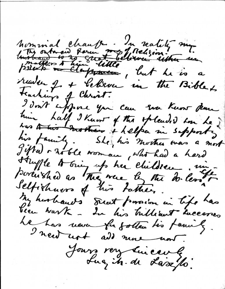 Lucy describes de László's conversions from Judaism to Catholicism and Protestantism. "The outward form of religion matters to him little, but he is a reader of & believer in the Bible & Teachings of Christ", she writes. De László was a great support to his "gifted and noble" mother; his father, by contrast, was selfish